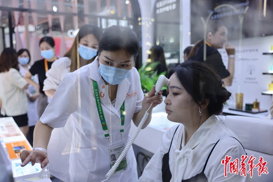 7月26日,海南海口,第二届中国国际消费品博览会法国馆一家护肤品品牌展位上,关注科技美肤的女性参观者排队体验AI智能测肤仪。这款测肤仪可实时显示放大30倍的毛孔并发送检测报告。