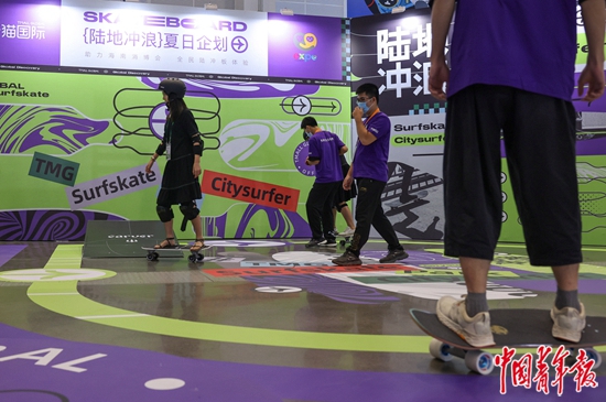 7月26日,海南海口,第二届中国国际消费品博览会上,一家参展商在进行陆地冲浪教学活动。陆地冲浪是当下十分受年轻人喜爱的一种运动,尤其在疫情背景下,年轻人纷纷拥抱户外运动,陆地冲浪不仅是一种锻炼,更具备社交功能。