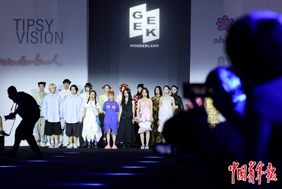 7月27日,海南海口,第二届中国国际消费品博览会时装周上,4个年轻品牌的设计师与模特在走秀结束后合影,他们中不乏00后。