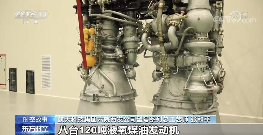 航天科技集团六院西发公司型号系列总工艺师 张和平:这就是长征五号用的发动机,长征五号一共用了八台120吨液氧煤油发动机。这个上面有许多新材料,典型的就是说在燃烧部分用的是高温合金。