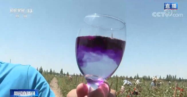 除了红枸杞之外,这里还种植了15000多亩的有机黑枸杞,黑枸杞的成熟时间要迟一些,在8月下旬,所以我现在手里只有黑枸杞干。大家可以看一看,如果我们把它也像红枸杞一样泡入水中的话,颜色展开得非常快,几秒钟的时间水就已经是蓝紫色了。当地的负责人告诉我,这很大程度是因为它的花青素含量高,所以黑枸杞也有另外一个名字,叫作“花青素之王”。