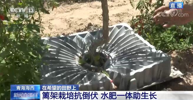在栽培种植方面,由于枸杞树苗比较脆弱,为了保证存活率,需要在温室里培育一定时间才能适应这里的气候,之后才会移植到室外,进行篱架栽培。而这样的种植方式主要是为了抗倒伏,这里风沙天气较为频繁,如果没有篱架的支持保护,枸杞树很容易会栽倒,结下的果子与地表接触一段时间后基本就会糜烂,产量就无法保证。大家可以再看一下枸杞树的底部,有一个黑色的水管,工人会在水里加入水溶肥,既能浇水又能施肥,达到水肥一体。底下灰色的托板有两个好处,一个是精准灌溉,因为在高海拔地区气候比较干燥、降水比较少,板上的凹槽能够将雨水和露水都汇聚到枸杞树;第二个是可以遮挡阳光,能够抑制杂草的生长。