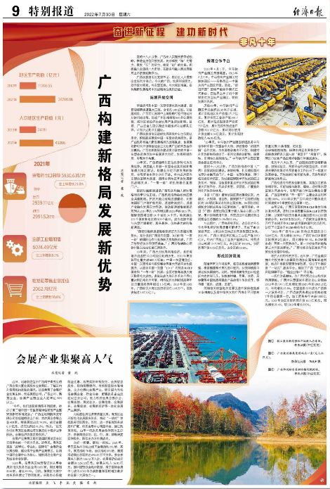 10年来,广西大力发展向海经济,北部湾港开启通航30万吨级巨轮的历史,2021年集装箱吞吐量突破600万标箱;中国—东盟博览会、中国—东盟商务与投资峰会等重大开放平台能级提升,从服务中国—东盟“10+1”向服务RCEP国家和“一带一路”拓展;全面对接粤港澳大湾区取得扎实成效,贵港港成为珠江水系首个吞吐量达到亿吨的内河港,梧州长洲水利枢纽船闸年过货量连续两年超过1.5亿吨。2012年至2021年,广西吸引大湾区投资项目约1.68万个,总投资超过4.67万亿元。