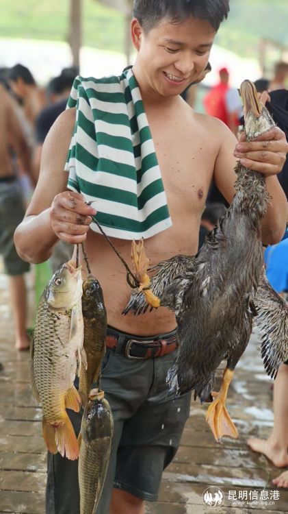 下午开始的这个活动让所有参与者和旁观者乐开了花。鱼在水底游,鸭子水上漂,不少人“按下葫芦浮起瓢”,手忙脚乱,又想抓鸭子,又想同时抓鱼,一阵“鸡飞狗跳”之后,两手空空;有的沉着冷静,先抓鸭子,因为数量少,之后才下手摸鱼,收获颇丰。这个活动对于有农村生活经验的人来说,是个“送分题”; 但是对于城市生活的游客来说,看似简单,实则大不容易。不过看着行家里手大丰收,围观群众倒也捡了个乐呵。
