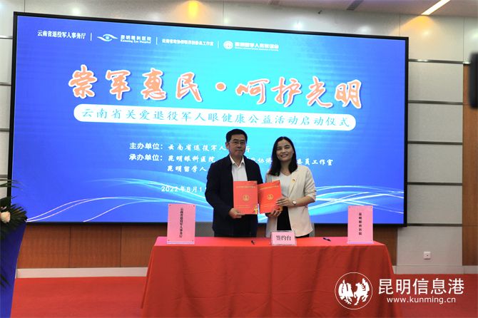 昆明信息港讯 记者俞逍 8月1日上午,“崇军惠民·呵护光明”——云南省关爱退役军人眼健康公益活动启动仪式在昆明举行,云南省退役军人事务厅与昆明眼科医院签署了拥军优抚合作协议。