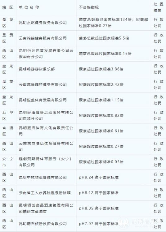 游泳池水水质检测项目为细菌总数、大肠菌群、尿素、游离性余氯、浑浊度、PH值等6项指标。针对7月份抽检不合格14家游泳场所,昆明市卫生健康委员会综合监督执法局将按照《游泳场所卫生规范》要求,依据《公共场所卫生管理条例实施细则》规定,对不合格游泳场所进行行政处罚。各游泳场所要根据自身存在的问题,及时找出游泳池水管理薄弱环节,加强水质处理管理,及时整改,确保游泳池水质符合国家卫生标准和要求。