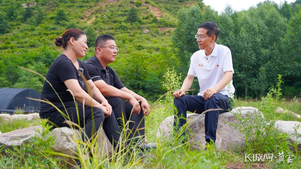 保定市委常委、阜平县委书记刘靖(右)介绍当地乡村振兴规划。