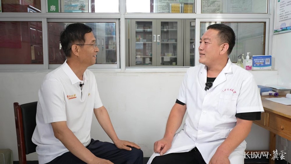 阜平县顾家台村村医薄利(右)介绍当地群众医疗保障情况。