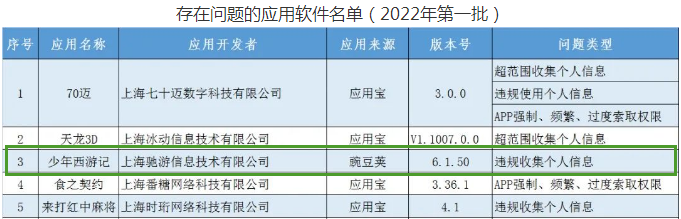 其中,由上海驰游信息技术有限公司开发的应用《少年西游记》(版本号6.1.50)存在违规收集个人信息问题。