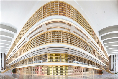 中国国家版本馆西安分馆文济阁巨型通顶书墙。人民日报记者张丹华/摄
