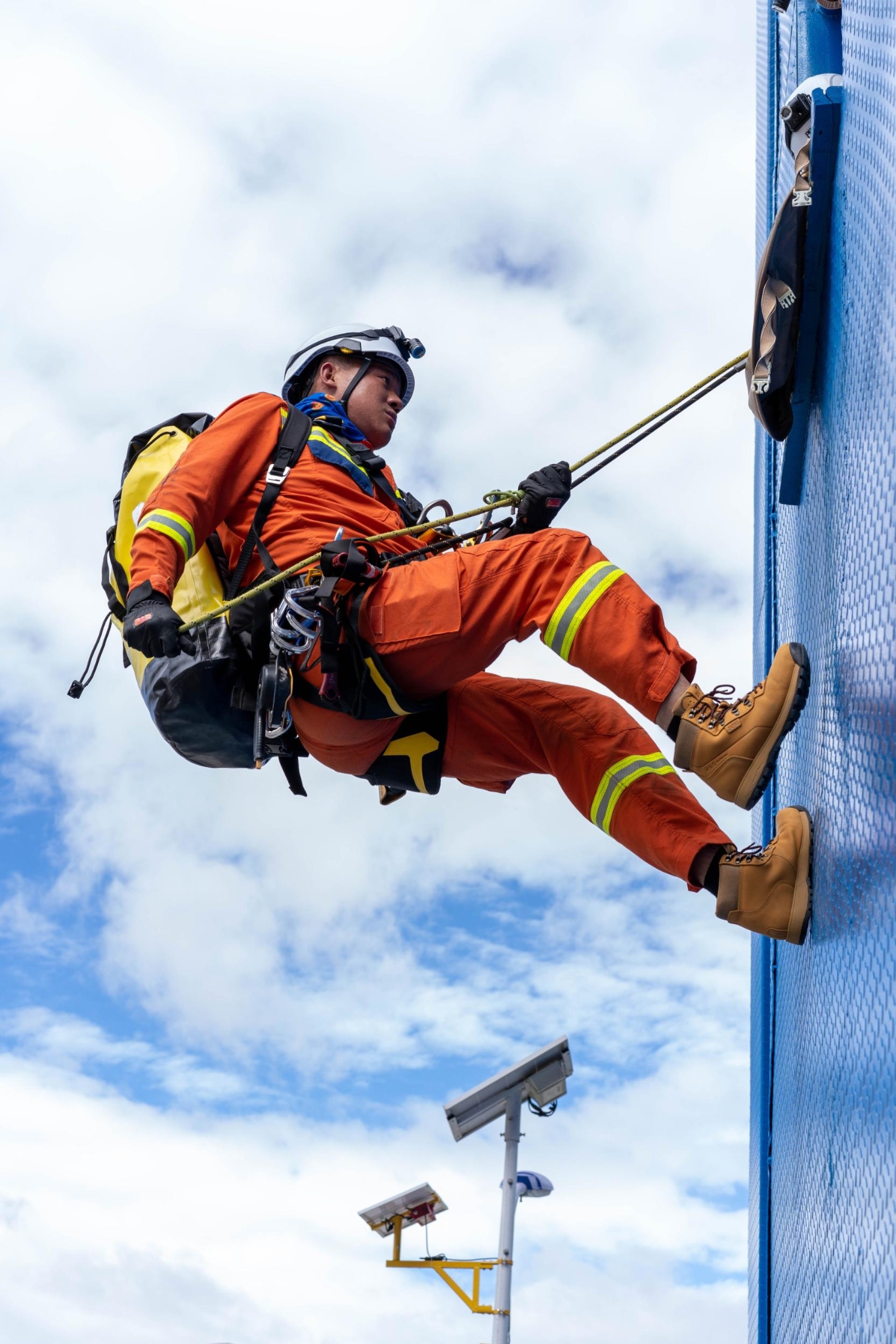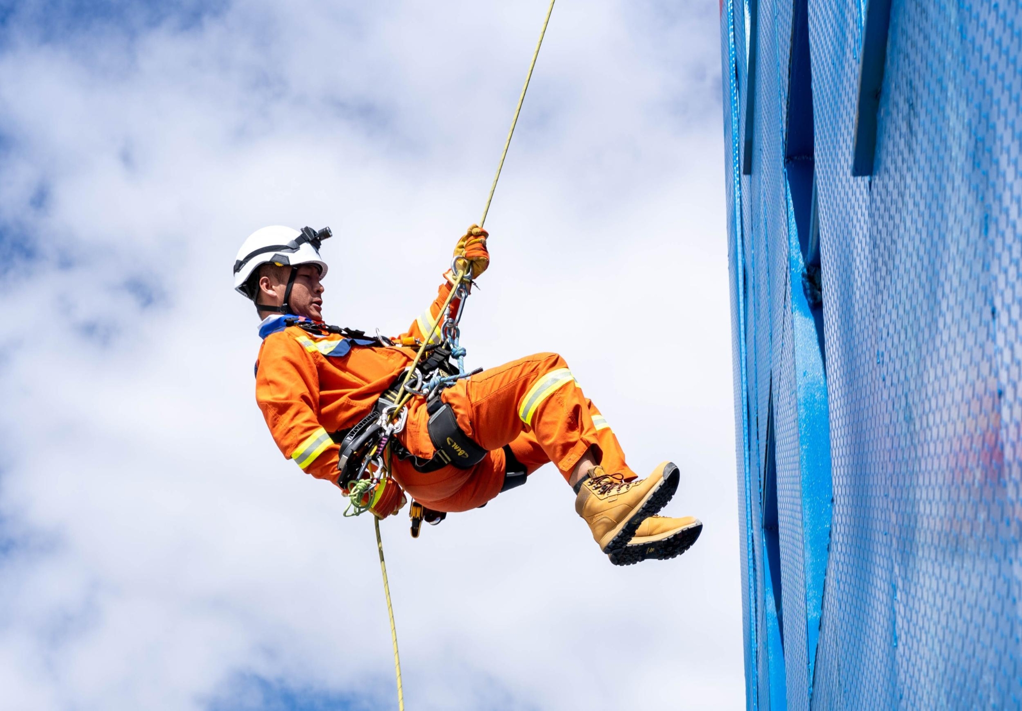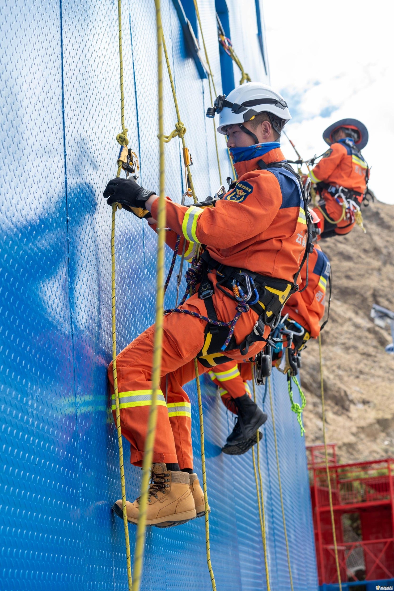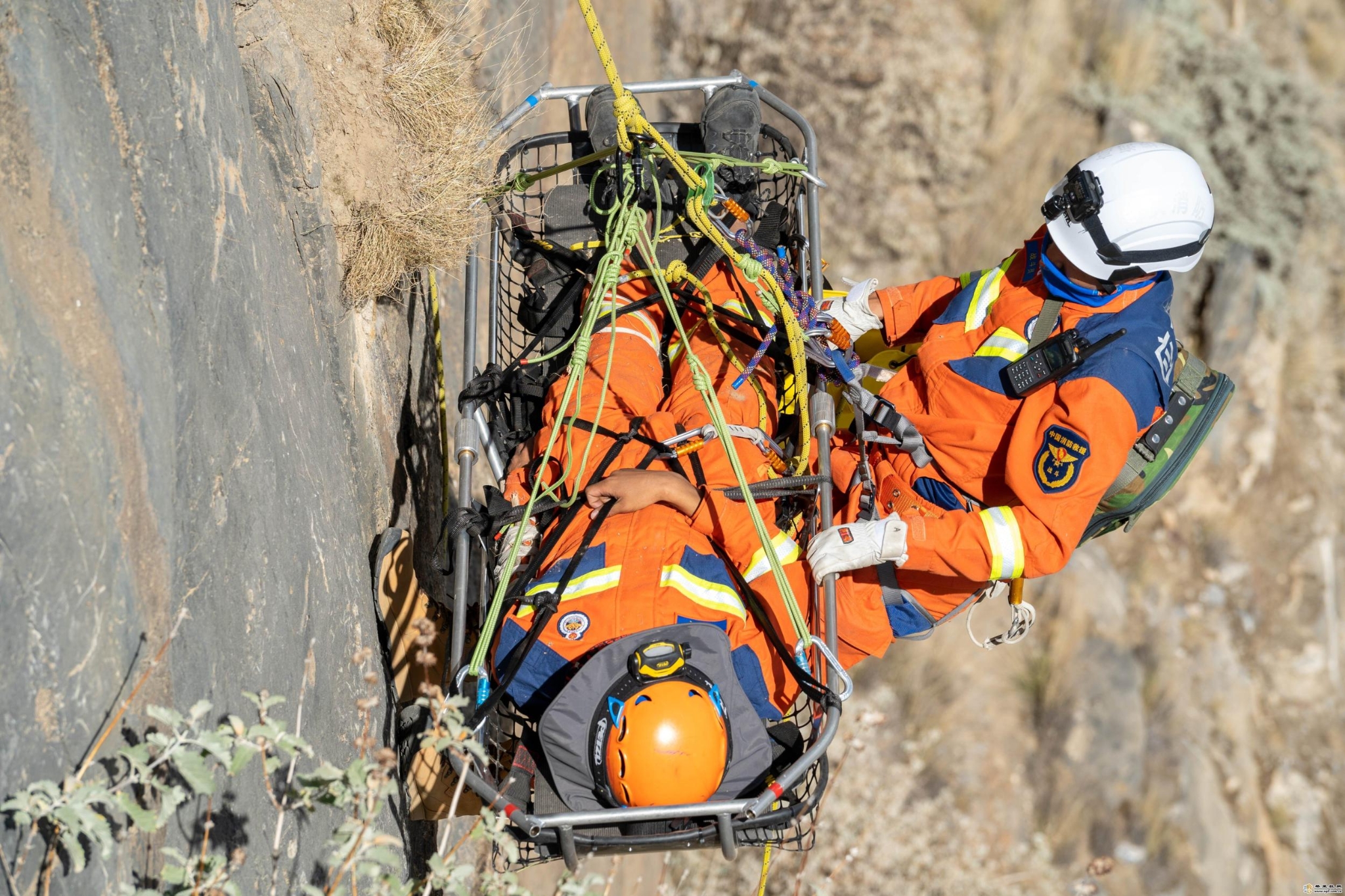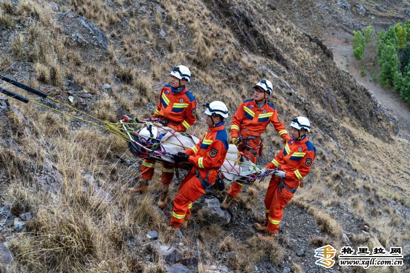 培训中,驻训队围绕装备基础知识、锚点及保护站建设、绳索技术等单人救援技术和超长距离救援、悬崖救援、岩壁救援等班组实战救援技术,分阶段开展山岳救援实操培训。在基础组培训环节,培训教员教授如何在高海拔极端条件下运用绳索制作简易全身吊带和背负救援系统,以及利用抓结、挂钩、绳索、八字环等轻便器材制作保护站、倍力提升和主动被动下降系统。在进阶组培训环节,培训教员对进出低岩角、悬崖垂直提升、伤员分段下放转运等科目进行了系统教学,参训学员分组进行实操实训。图为参训学员在实操实训中。 (香格里拉网 吴姗蕙 辛余)