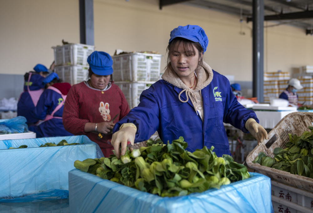 脱贫群众在云南省曲靖市会泽县一蔬菜冷链企业分拣蔬菜(2022年3月3日摄)。新华社记者陈欣波/摄
