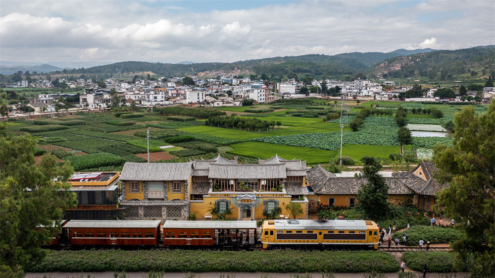 游客在云南省建水县乘坐米轨小火车来到乡会桥站游览(2022年7月1日摄,无人机照片)。新华社记者胡超/摄