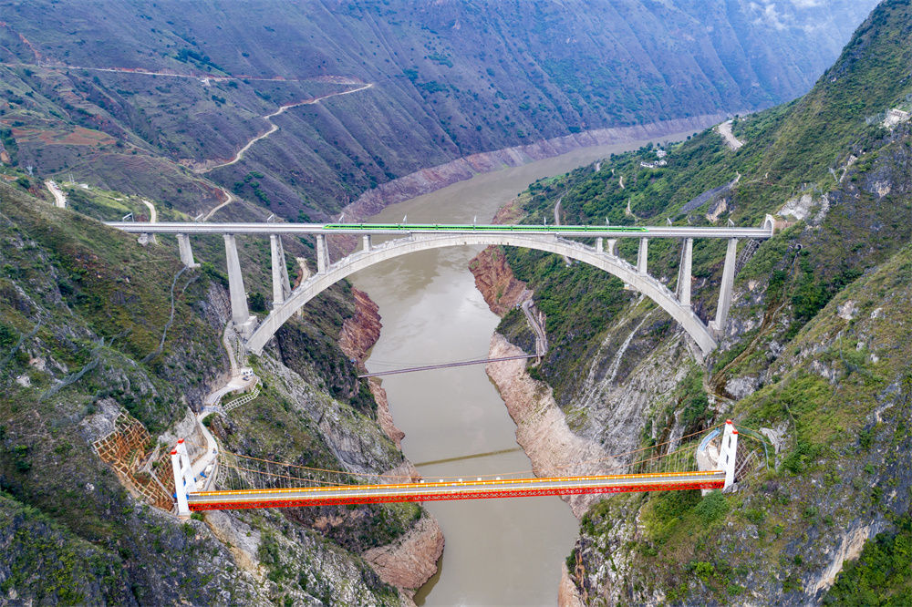 复兴号列车通过大瑞铁路大保段澜沧江特大桥,红色桥梁为中缅油气管道桥,下方为霁虹桥,呈现三桥并跨澜沧江景观(2022年7月22日摄,无人机照片)。新华社记者陈欣波摄