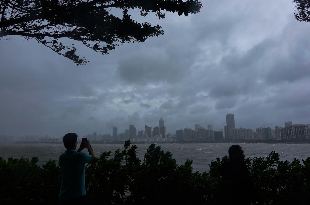 2021年10月13日,市民在海口市保利中央海岸拍摄台风“圆规”登陆情况。新华社记者 杨冠宇 摄