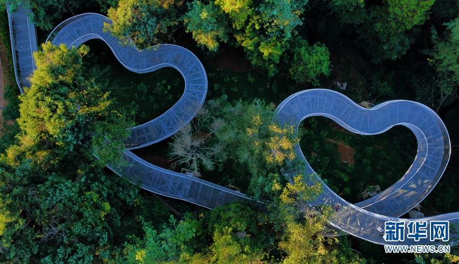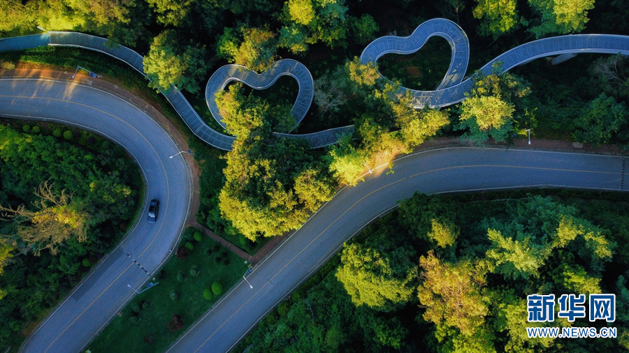 花海、鸟语、湖泊、山林……春城昆明的浪漫远不止于此。近来,昆明又多了一个“打卡地”——世博绿道。从航拍图看这条绿道,“双心”栈桥盘在绿荫中,让到这里的市民、游客连散步都是“爱你的形状”。