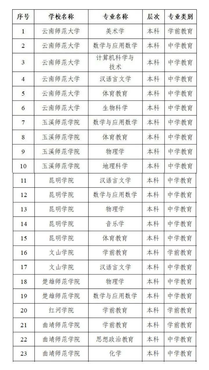 8月4日,教育部官网发布《教育部办公厅关于公布2022年通过普通高等学校师范类专业认证专业名单及通过中期审核专业名单的通知》,共169所高校入选。其中,云南有7所高校入选,共23个专业,通过普通高等学校师范类专业认证。