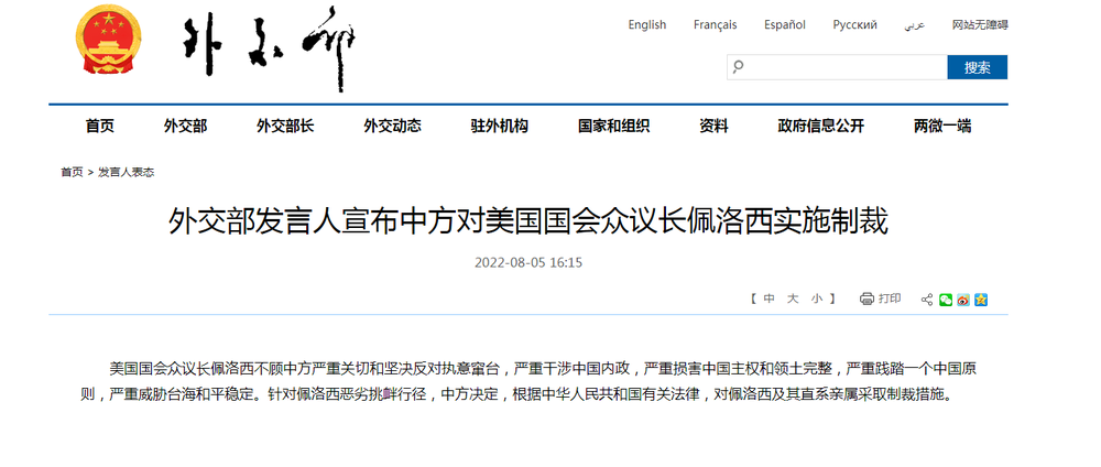 外交部发言人宣布中方对美国国会众议长佩洛西实施制裁