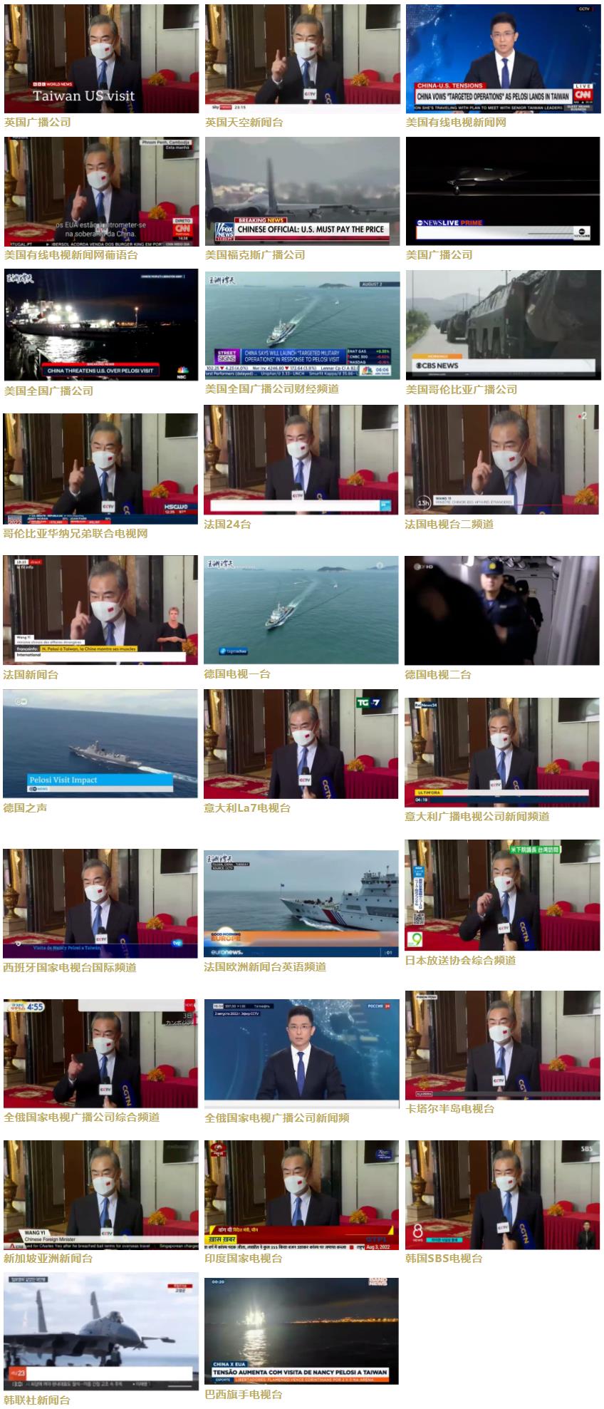 总台国际视频通讯社聚焦外交部、国台办、东部战区等权威表态,可视化制作编发《国际锐评》《玉渊谭天》等相关评论言论。截至8月4日10时,共有84条新闻素材得到BBC、CNN、CNBC、英国天空新闻台、法国24台、法国电视台、法国新闻台、德国电视一台、德国电视二台、德国之声、意大利广播电视公司、意大利TGCOM24电视台、加拿大广播公司、加拿大最大的商业电视网CTV、俄罗斯第一频道、全俄国家电视广播公司、日本NHK、韩国KBS、巴西环球电视台、印度国家电视台、新加坡亚洲新闻台、澳大利亚广播公司、卡塔尔半岛电视台、墨西哥阿兹特克电视台、印尼国家广播电视台等102个国家和地区的1683个电视台及新媒体平台采用。