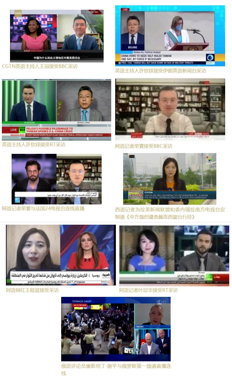 总台多语种主持人、评论员和网红积极走向全球多个主流媒体的台前,通过视频连线、撰写稿件、接受采访、参与节目以及在海外社交平台发声等形式,强调中国立场,阐释中国采取相关反制措施的合理性和必要性,揭批佩洛西等美政客的虚伪嘴脸,向国际舆论场发出有理有节、有力有效的中国声音。