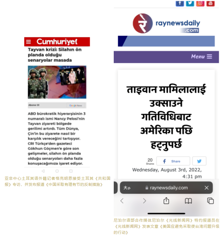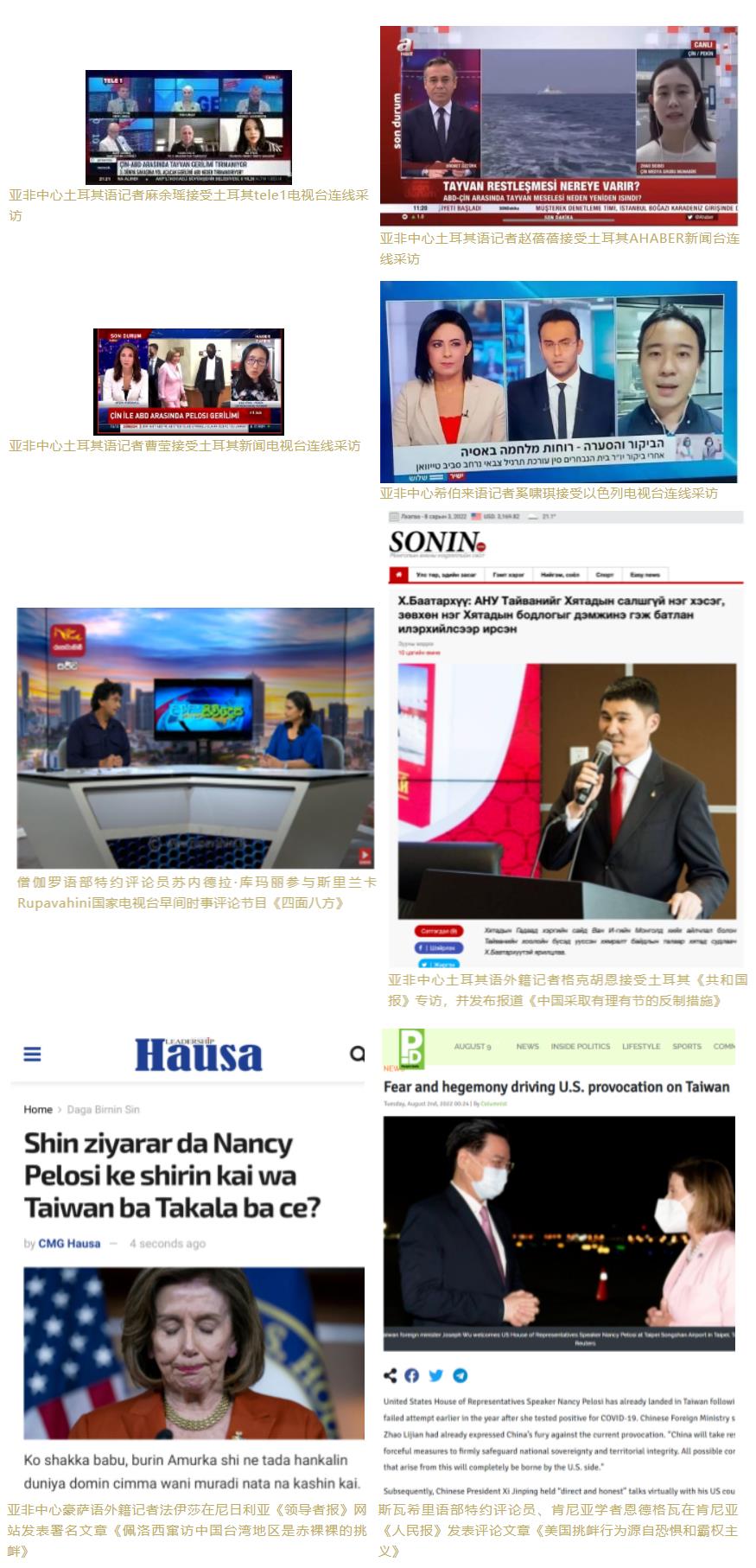 亚非中心土耳其、希伯来语、豪萨语、尼泊尔语、蒙古语等多语种主播、评论员和网红积极在多家外媒发声,接受了包括以色列电视台、土耳其AHABER新闻台、土耳其TGRT电视台、土耳其新闻电视台等多家国际媒体的采访连线,同时多名外籍记者、海外特约评论员在尼日利亚《领导者报》网站、尼泊尔《光线新闻网》、肯尼亚《人民报》、蒙古国媒体SONIN.MN等对象国主流媒体发表评论及署名文章,对外阐释中方立场和反制措施的合理性、正当性,介绍台湾问题历史经纬,揭批美国在台湾问题上的背信弃义。
