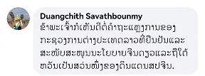 老挝新闻文化旅游部前副部长扎伦·瓦林塔萨(Chaleune Warinthrasak)留言:“老挝外交部的声明及时而严正,任何时候我们只支持一个中国原则,台湾是中国不可分割的一部分。”