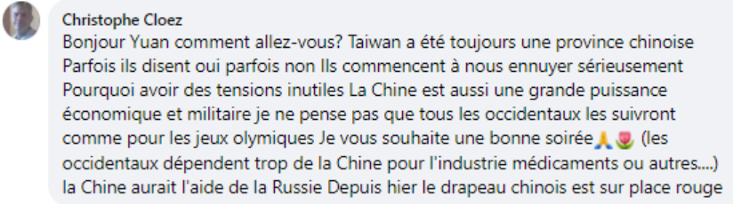 法语网友克罗兹:“台湾始终是中国的一个省,美国人一会儿承认一会儿又不承认,现在他们又开始捣乱。为什么要制造这种毫无意义的紧张气氛呢?中国是一个经济和军事大国,我不认为西方会跟着美国走,就像之前的奥运会一样,西方国家太依赖于中国工业了。俄罗斯应该是支持中国的吧,昨天红场上方都飘着中国国旗。”