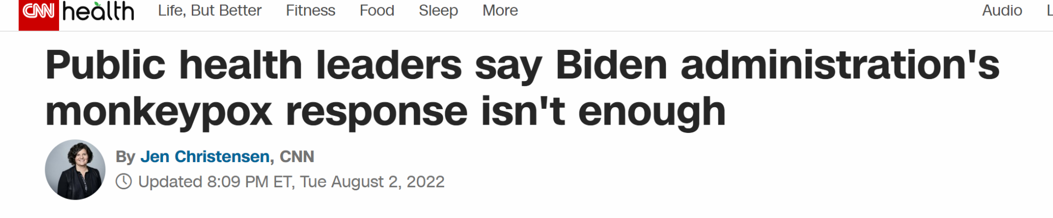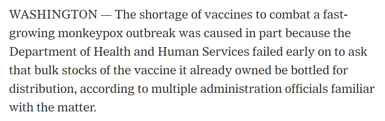 《纽约时报》:多名官员披露,美国卫生与公共服务部未曾要求制药商将政府储备的猴痘疫苗分装成小瓶,导致美国当前猴痘疫苗供应不足。一名前疾病控制与预防中心顾问批评联邦政府对猴痘疫情的应对与新冠肺炎疫情的前期表现一样糟糕:充斥着官僚作风导致的延误与不当回事,并且推卸责任。