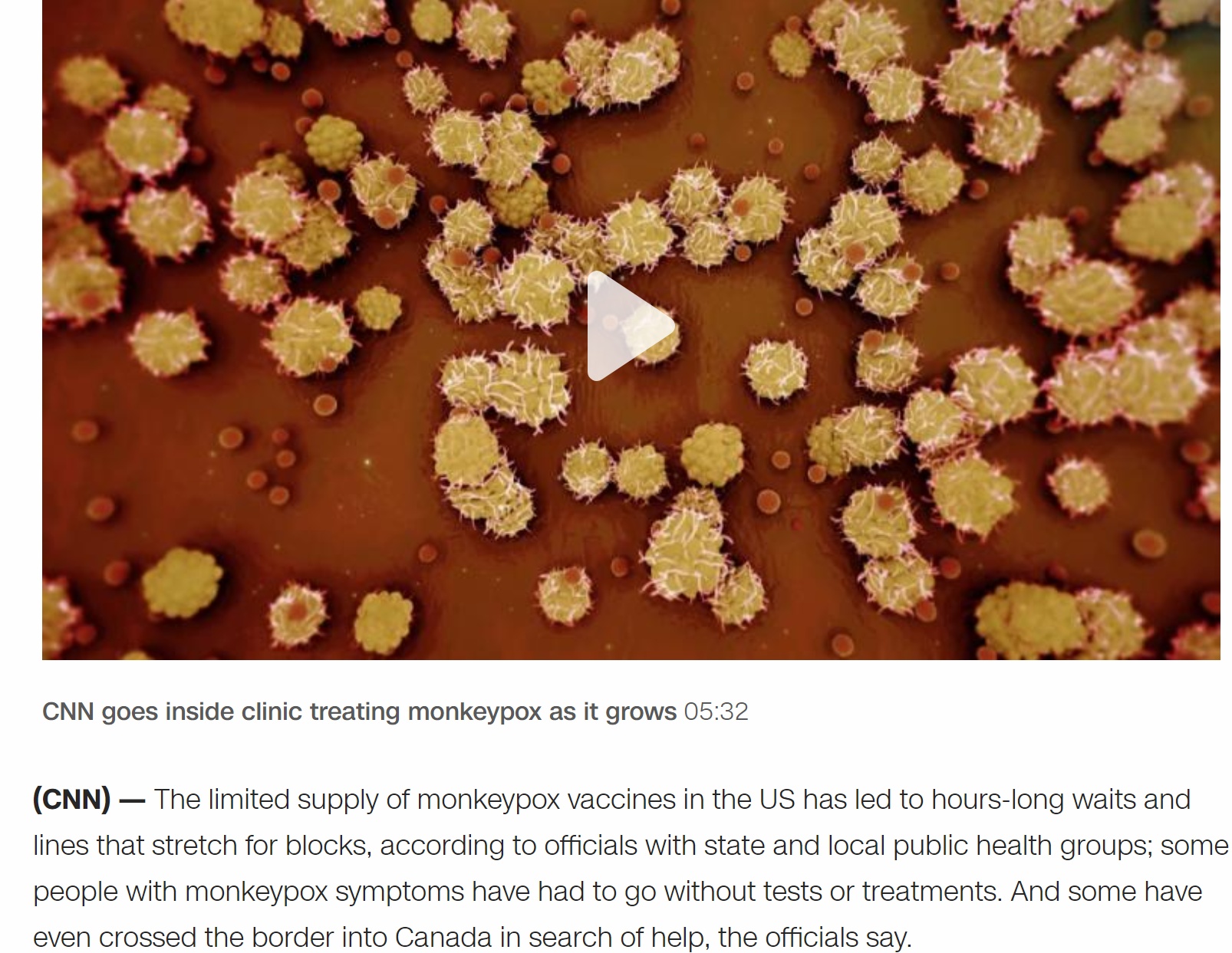 据美国有线电视新闻网报道,一些出现猴痘症状、疑似感染猴痘的民众无处做检测、无处治疗,感到自己“被政府抛弃了”。其中一些人不得不赴加拿大寻求医治。