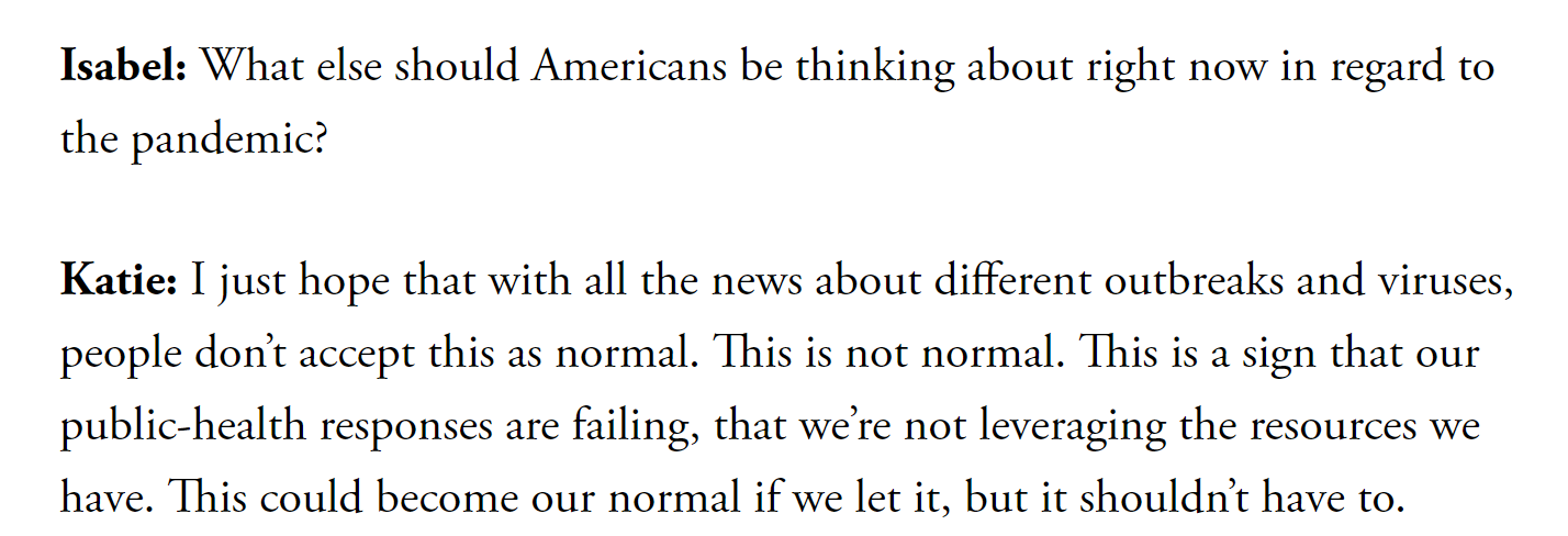 耶鲁大学公共卫生学院副教授格雷格·贡萨尔维斯反思说:“一种新的流行病正在美国暴发,当2020年发生的所有错误、我们公共卫生和医疗保健系统的所有缺陷、我们社会保障系统的各种问题再次充分展现出来时,人们不得不怀疑,我们什么时候才能吸取教训?!”