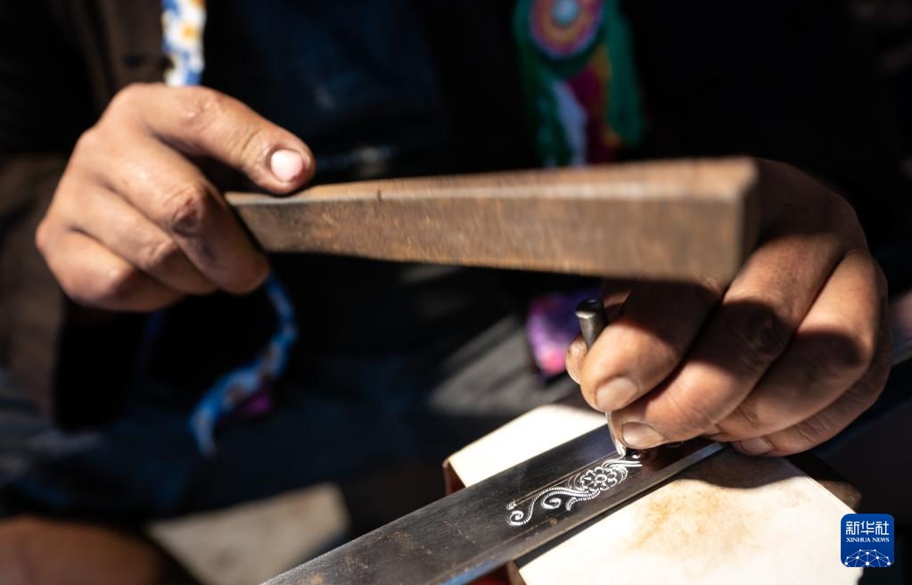 这是正在雕花的户撒刀(8月5日摄)。新华社记者 王冠森 摄