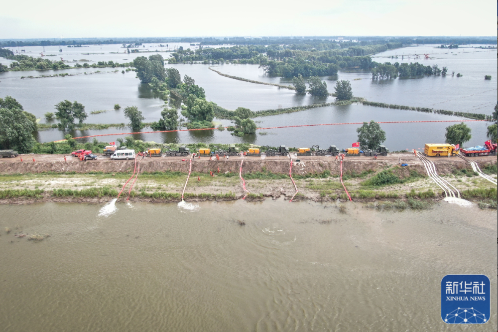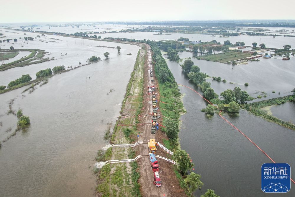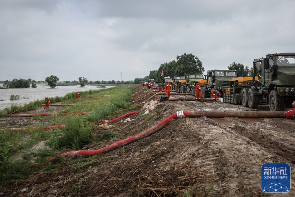 辽宁盘锦市,绕阳河左岸曾经的河堤溃口北段,8台发电机组驱动着12台潜水泵,将堤坝西侧水淹区的洪水源源不断抽出,通过25米长的管道,倾泻到绕阳河河道之中……