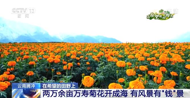 除了传统果蔬之外,美丽的鲜花也迎来了收获的季节。这段时间,云南省腾冲市的2万多亩万寿菊竞相绽放。花海连绵不断,不仅装点了美丽乡村,也给花农们开辟了更多增收渠道。