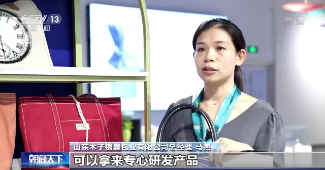 山东木子锦囊包业有限公司总经理 马燕:基地给我们提供的一站式保姆式的服务,我们所有的时间可以拿来专心研发产品,出口业务是有很大的提升。