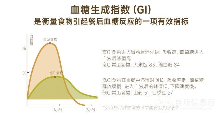 根据第6版《中国食物成分表标准版》:高升糖(高GI)食物,进入胃肠后消化快、吸收率高,葡萄糖释放快,葡萄糖进入血液后峰值高;低升糖(低GI)食物,在胃肠中停留时间长,吸收率低,葡萄糖释放缓慢,葡萄糖进入血液后的峰值低,下降速度慢。食物血糖生成指数可以用于对于糖尿病患者、高血压患者和肥胖者的膳食管理,也可用于运动员的膳食管理。