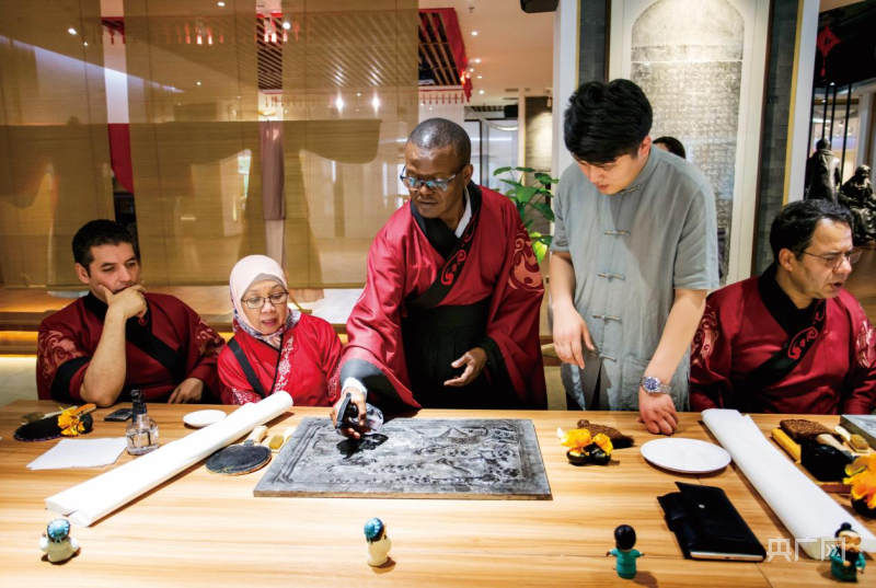 外国友人在孔子学院总部体验基地感受中国传统文化(央广网发 济宁市委网信办供图)