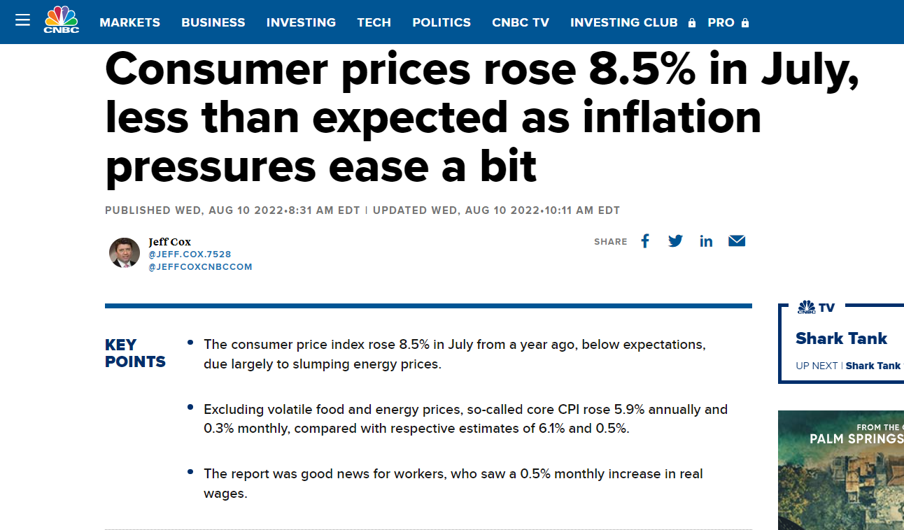 美国劳工部数据显示,美国7月CPI同比上涨8.5%,低于市场预期的8.7%,同比涨幅相比6月的9.1%略有缩窄。与此同时,7月CPI环比上涨0%(持平),低于市场预期的0.2%,环比涨幅相比6月的1.3%出现回落。
