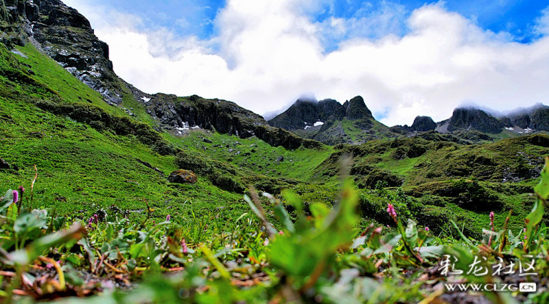 秘境南极洛,山高路险,海拔四千米,盛夏美丽鲜花映衬雪域湖泊。