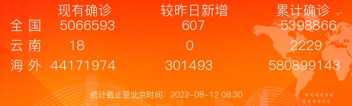 截至2022年8月11日24时,全省现有确诊病例18例,累计治愈出院病例2210例,累计死亡病例2例,累计报告确诊病例2230例。累计追踪到密切接触者85779人,尚在医学观察的密切接触者1046人。