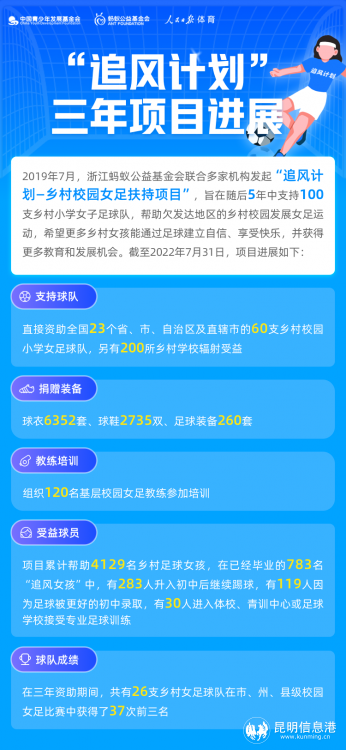 2019年7月,浙江蚂蚁公益基金会联合多个合作伙伴共同发起“追风计划——乡村校园女足扶持项目”,旨在随后5年中支持100支乡村小学女子足球队,帮助更多乡村女孩能通过足球建立自信、享受快乐,并获得更多教育和发展机会。三年来,在蚂蚁公益基金会和中国青少年发展基金会的推动下,该计划已直接资助了全国23个省、市、自治区及直辖市的60支乡村校园小学女足球队,另有200所乡村学校辐射受益。其中云南省共有7所小学入选,为全国最多。