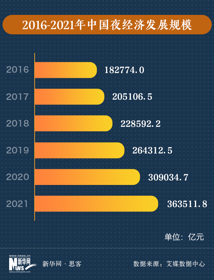 中国的“夜经济”规模有多大?根据商务部城市居民消费习惯调查报告显示,夜间时段已经承担起国内整个居民消费的60%。艾媒咨询的调查数据显示,自2016年以来,中国的“夜经济”规模快速增长。到2021年,总规模已达到36.35万亿元,艾媒咨询测算,2022年“夜经济”增速将持续增加,有望突破40万亿元。