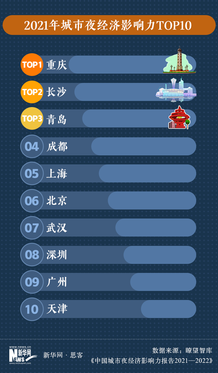 根据瞭望智库发布的《中国城市“夜经济”影响力报告2021—2022》,重庆、长沙、青岛、成都、上海、北京、武汉、深圳、广州和天津,位居2021年城市“夜经济”影响力前10名。同时,长沙天心区、北京朝阳区、重庆渝中区、江北区和永川区,青岛西海岸新区、上海静安区等20个区县,位居2021年“夜经济”影响力区县20强。