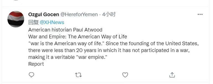 英国网友厄兹居尔·格琴对报告中援引的一段话很有共鸣:美国历史学家保罗·阿特伍德在2010年出版的《战争与帝国:美国的生活方式》一书中指出,“战争是美国人的生活方式。”美国自建国以来,没有参加战争的时间不足20年,是一个名副其实的“战争帝国”。