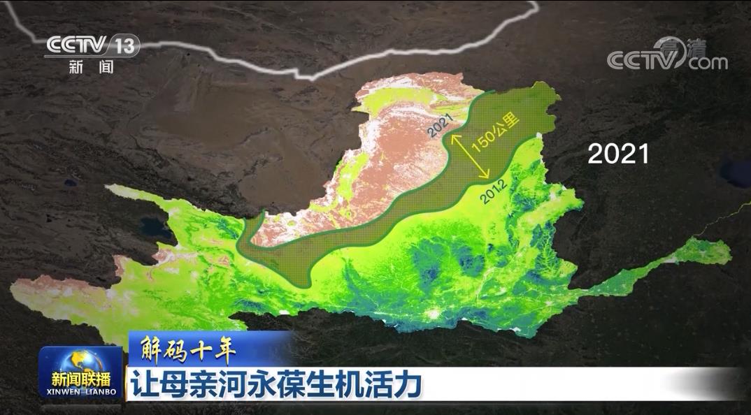 这是卫星视角拍摄到的黄河,研究人员连续数年监测,结合大数据还原了黄河沿岸的生态状况。可以清晰地看到,十年间绿进沙退,这条黄河生态绿线最宽处向前推进了约150公里。