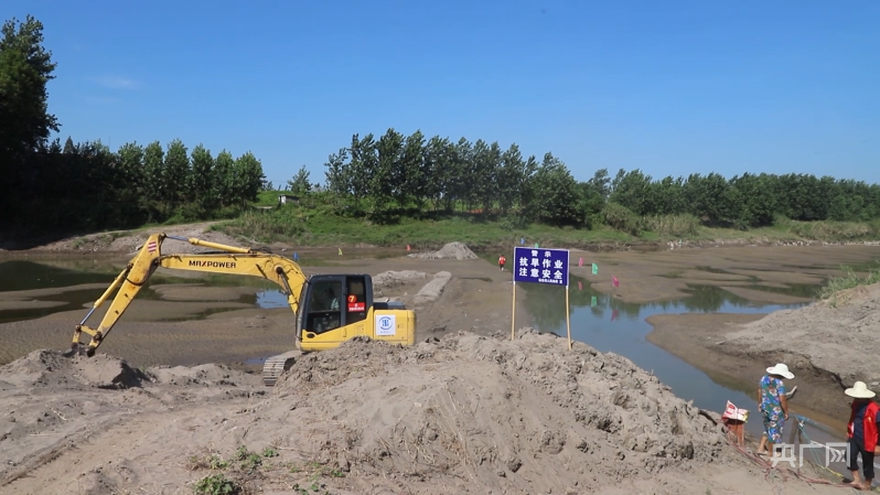 在藕池河东支鲇鱼须河建兴剅,挖掘机在河道清淤疏浚,抽水设备开足马力灌溉。