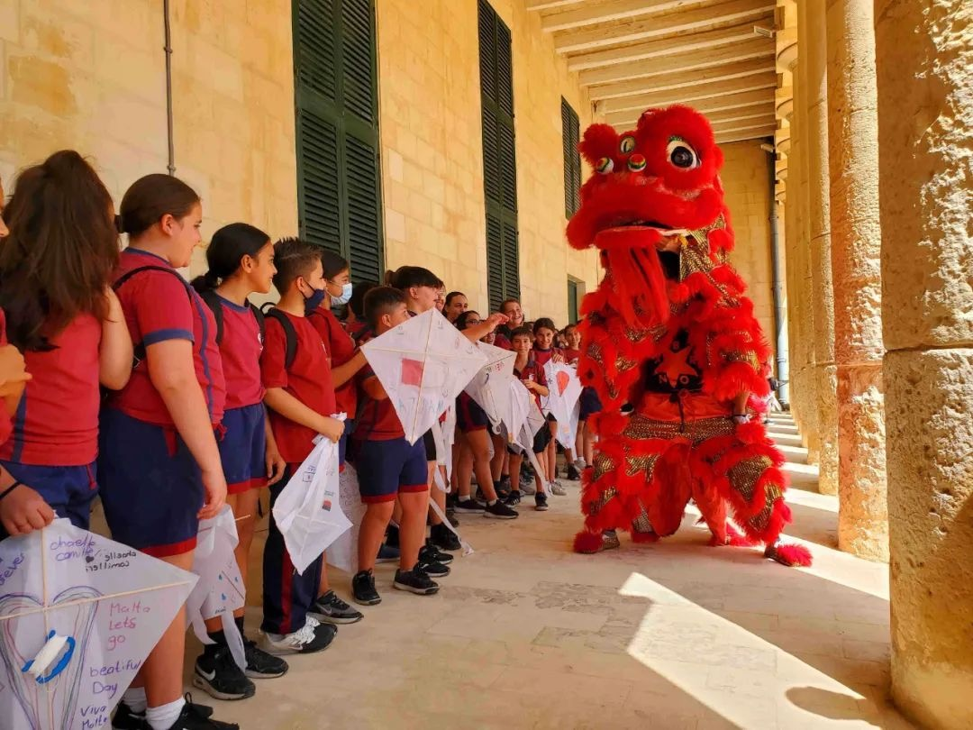 参加“中国风筝节”的马耳他学生观看舞狮表演。
