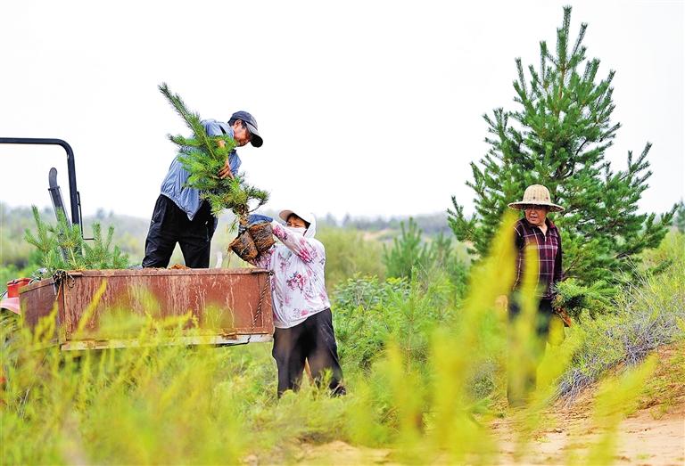神木市锦界镇圪丑沟村,村民在搬运栽种的树苗。经过近20年的治沙造林,当地植被覆盖度由原来3%提高到现在的65%。