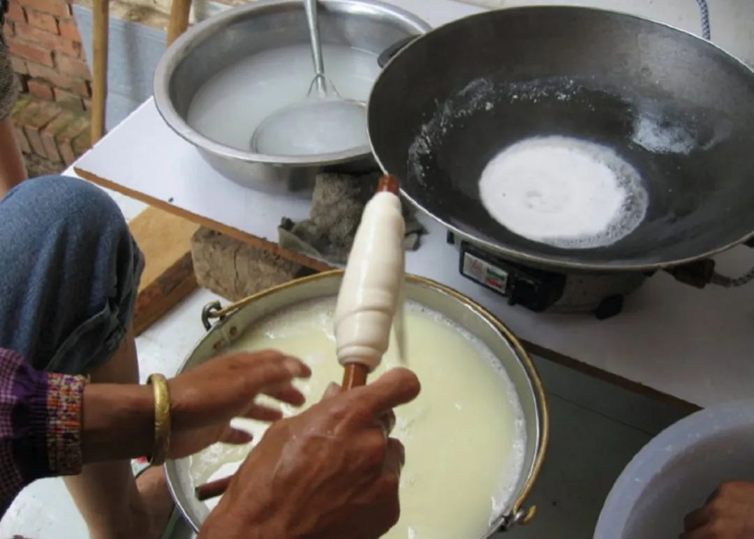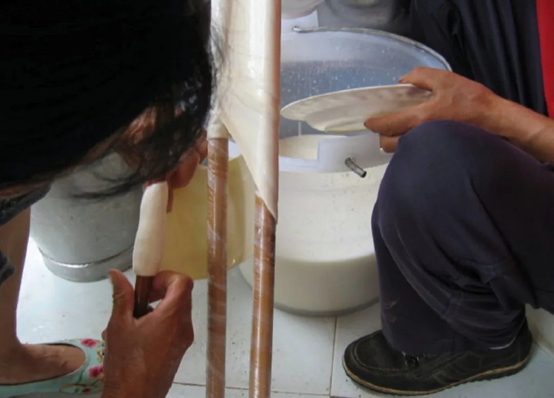 乳扇的制作过程充满趣味性。首先要准备一碗酸浆,这酸浆往往来源于上一次做乳扇时从牛奶中分离出的水分;然后在盛好的大盆鲜牛奶中倒入酸浆,慢慢升温熬煮,待鲜牛奶逐渐凝结后,由制作者如同揉面一般揉成“奶饼”;最后,要把“奶饼”拉薄,一层一层斜着缠绕在两根并列的木棍上,好似折扇一般。