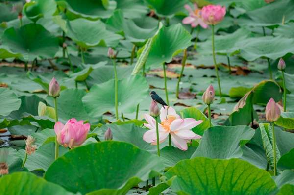 荷花绽放,四溢幽香,引来众多小鸟伫立花尖,飞行穿梭在荷花丛中,或飞翔嬉戏,或停留小憩,成为赏荷的一道独特亮丽风景。