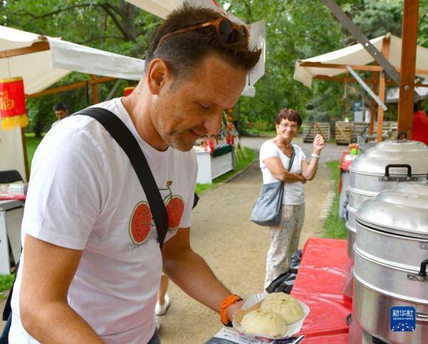 8月13日,在德国柏林世界公园,一名男子在中国展区选购包子。
